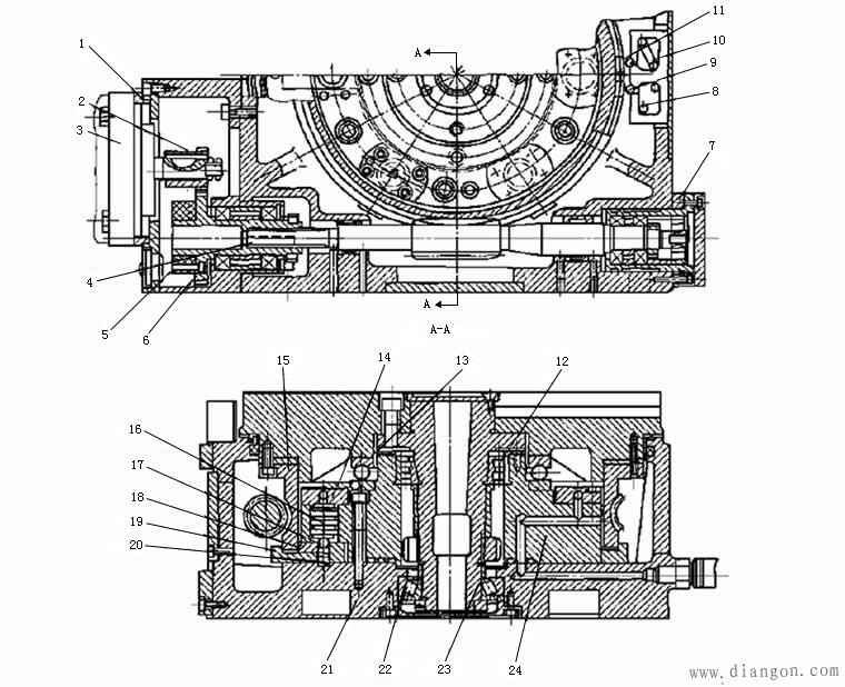 通常分度工作台的分度运动只限于某些规定的角度,不能实现0°~360°范围内任意角度的分度。为了保证加工精度,分度工作台的定位(定心和分度)精度要求很高,要有专门的定位元件来保证。