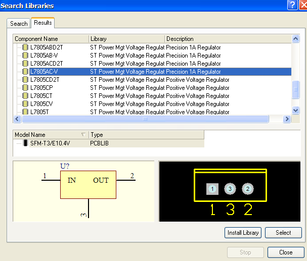 可以看到很多匹配搜索标准的元件型号,选择一款适合的元件原理图符号和封装。这里选择元件L7805AC-V,属于ST Power Mgt Voltage Regulator.IntLib库。能否找到所需要的元件关键在于输入的规则设置是否正确,一般尽量使用通配符以扩大搜索范围。