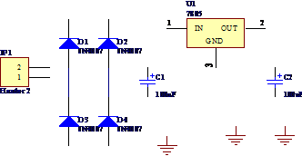 绘制出如图1-1所示的稳压电源电路原理图,其中纸型设置为A4、改变工作区颜色、方向设置为水平方向,最后将图纸命名为“Power-7805.SchDoc”进行保存。